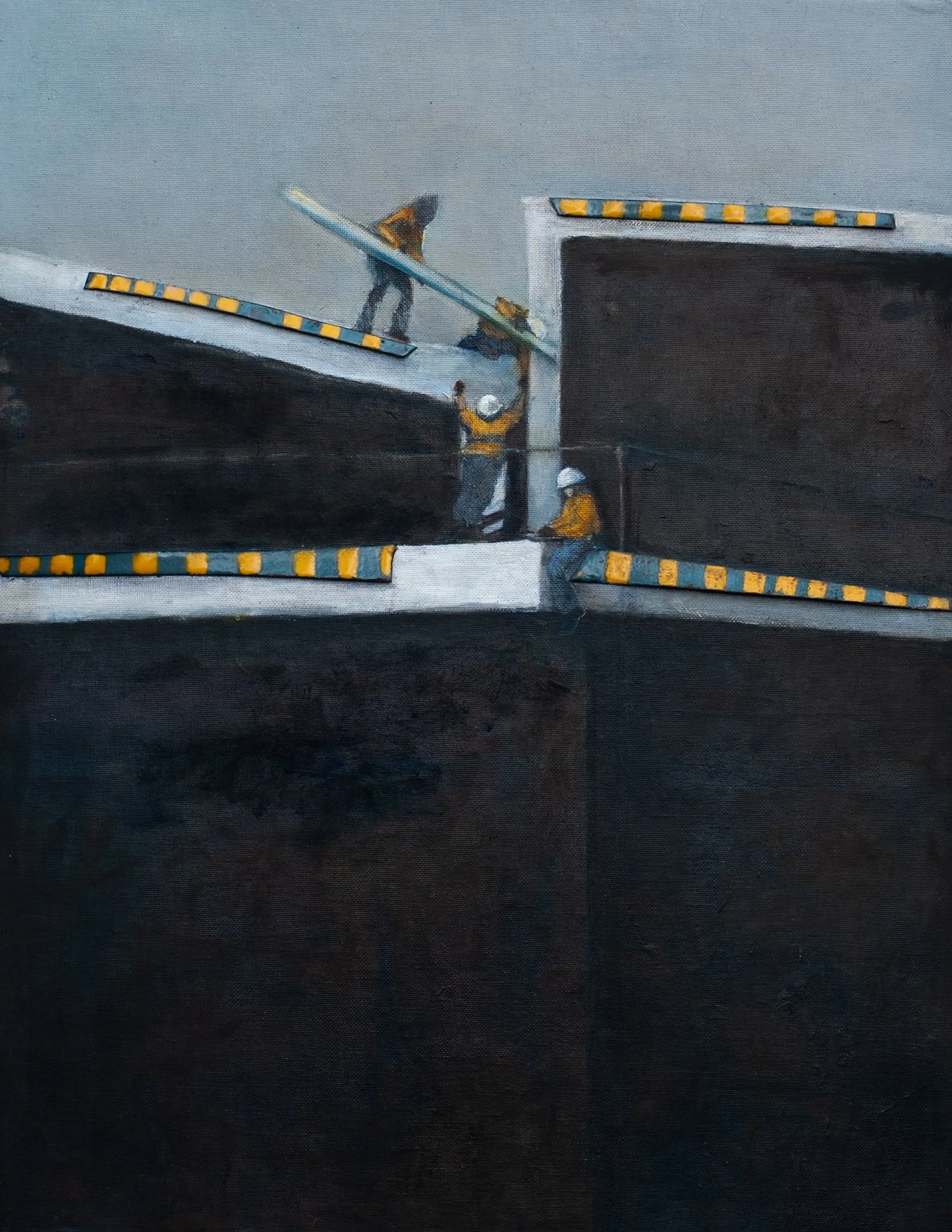 The Surveyors at the Quarry, oil on canvas board, vitreous enamel fused to copper, 16 inches x 10 inches